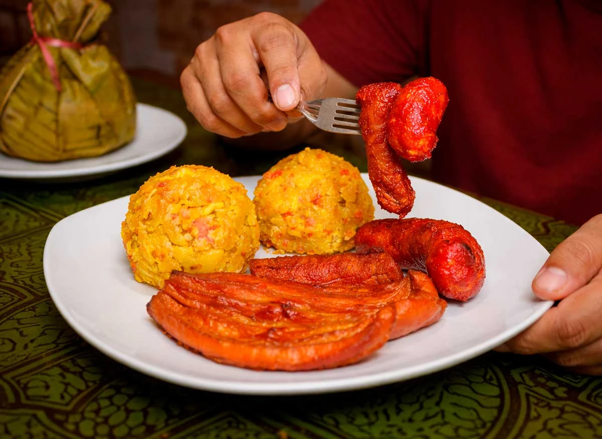 - Juane, elaborado con arroz y pollo, envuelto en hojas de bijao.
